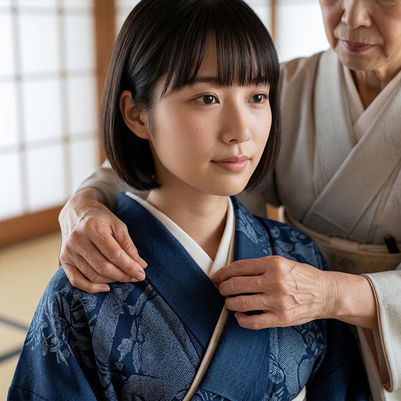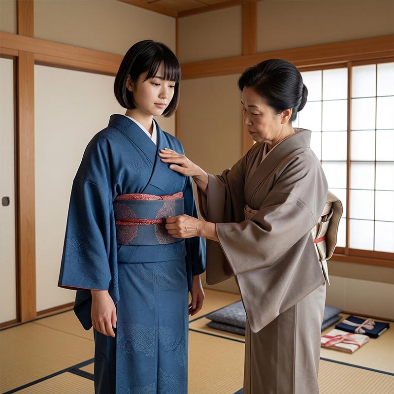 Start with wrapping the left side over the right (as the reverse is used for funerals). Secure it with a koshi-himo (thin sash) before adding the obi, the wide belt that defines the waist. Keep your collar neat and high, and let the sleeves drape gracefully.